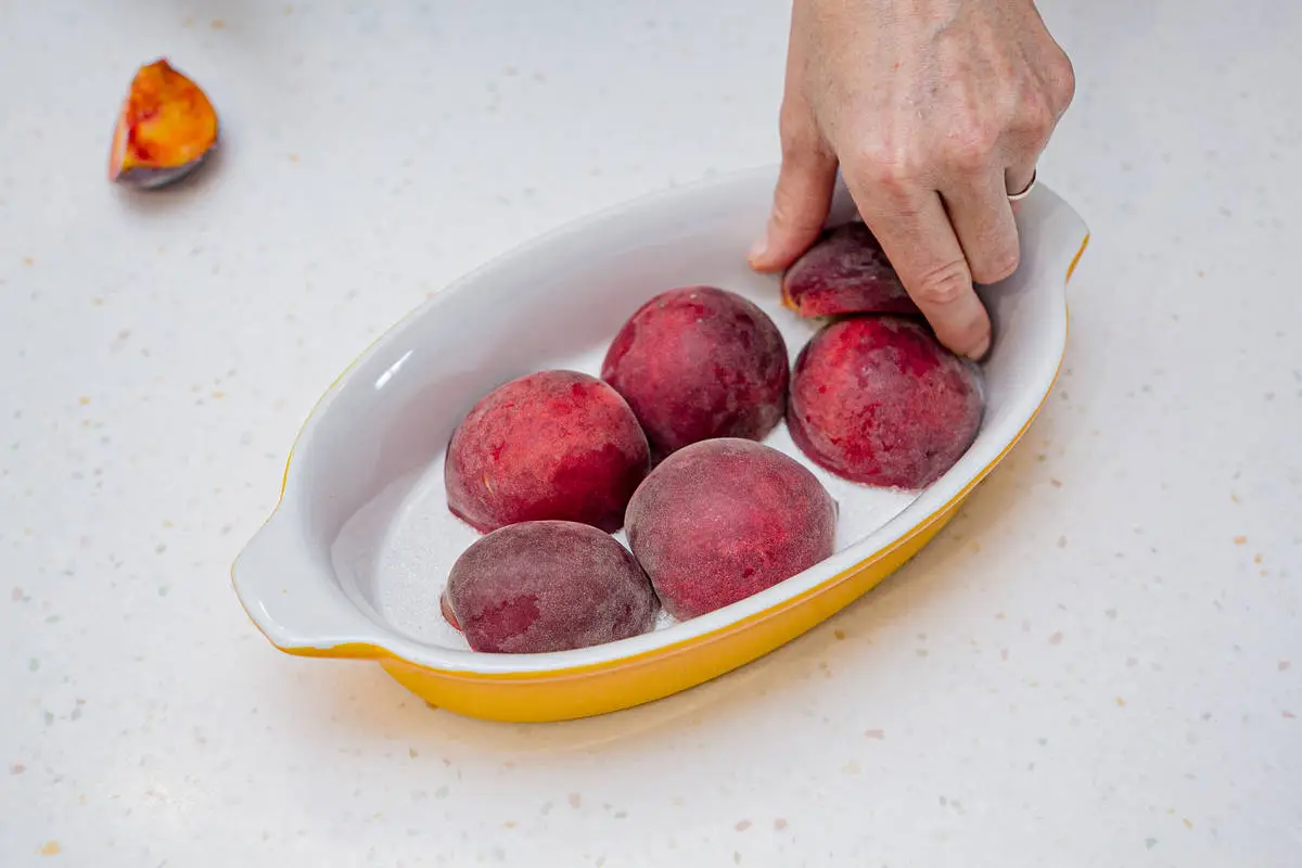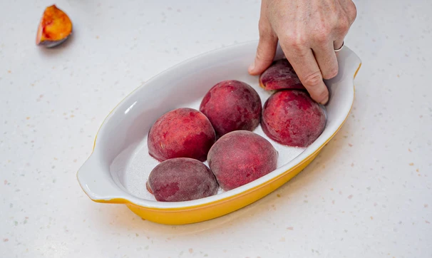 Персики разрежьте пополам, удалите косточки. Выложите в форму срезами вниз. Сверху насыпьте крошку из теста.