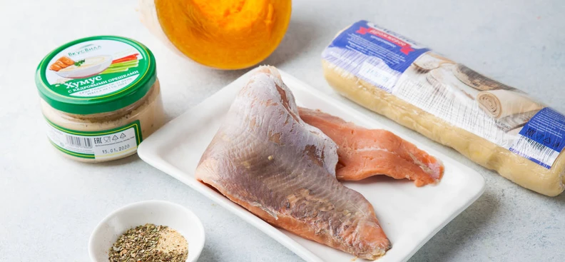 Красная рыба в тесте со шпинатом и хумусом из тыквы