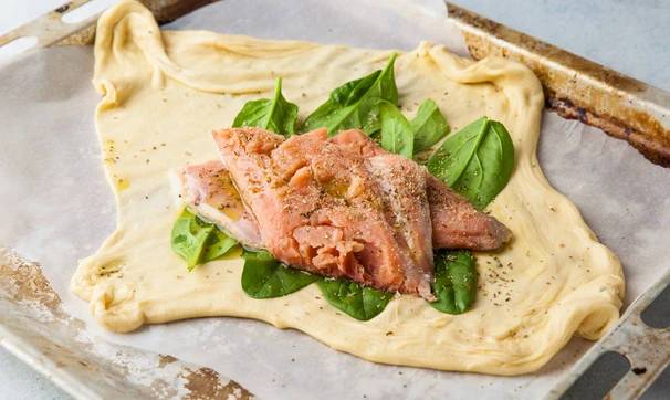 Выложите на тесто шпинат, а сверху — рыбу. Посолите и поперчите. Сверните тесто конвертиком. Промажьте взбитым яйцом.