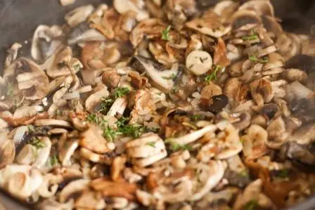 Лук мелко порезать и обжарить на растительном масле, затем добавить грибы (лесные подготовить так, как вы делаете это обычно, шампиньоны и белые не нуждаются в предварительной обработке), обжаривать все вместе несколько минут.