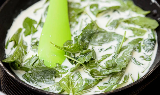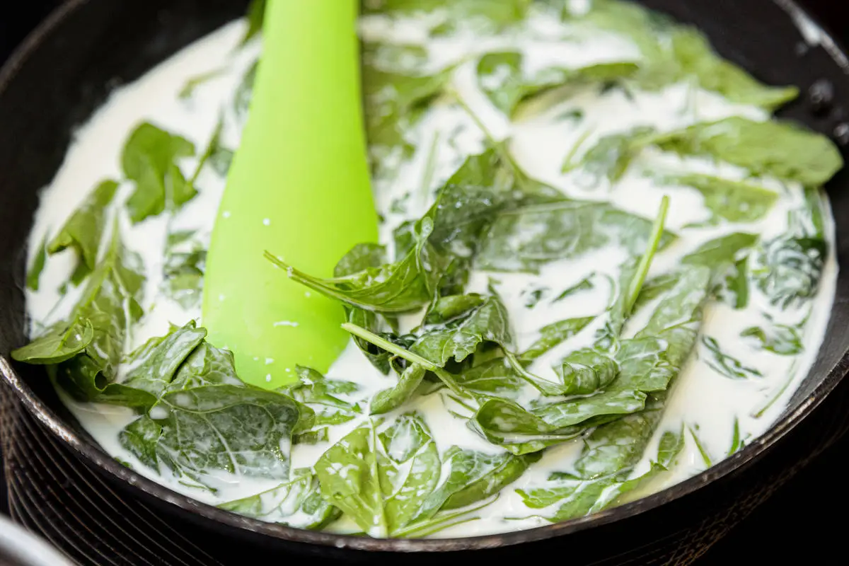Шпинат прогрейте в сливках с солью.