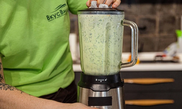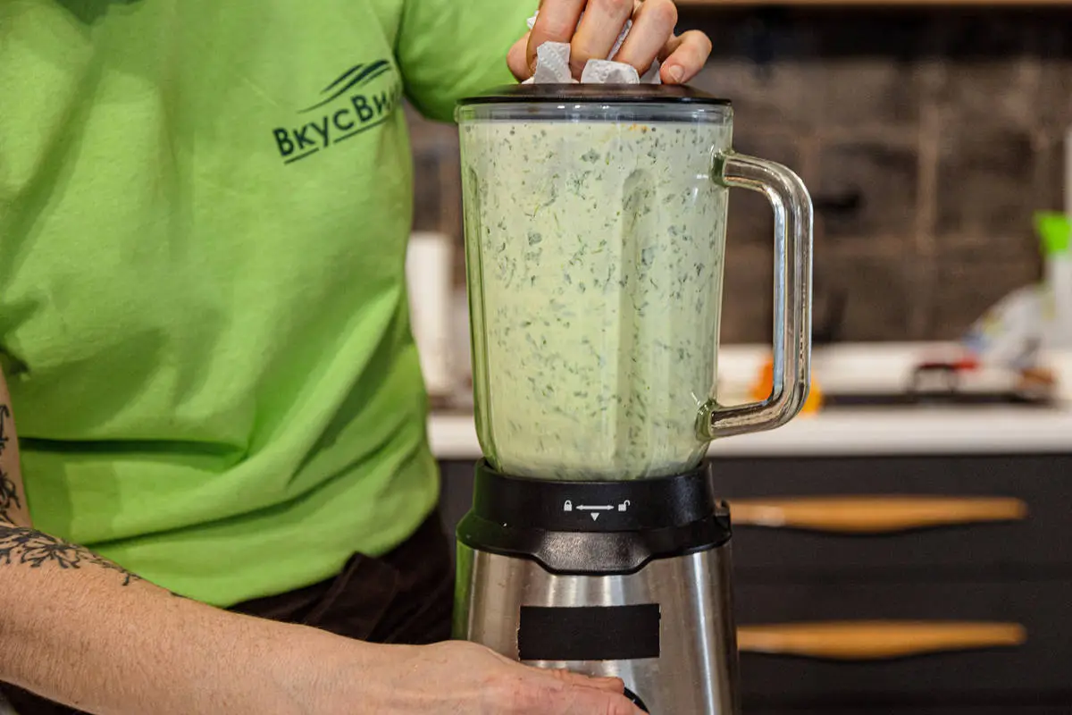 Пробейте шпинат в блендере с укропом и небольшим количеством воды до однородности, затем добавьте картошку и очень быстро пробейте. Если пробивать картофель слишком долго, суп может приобрести неприятную клейкую консистенцию.