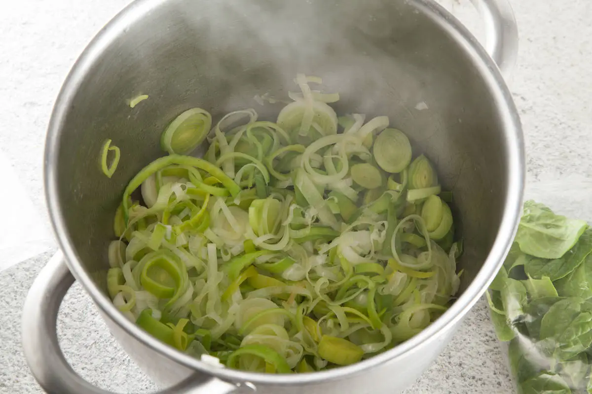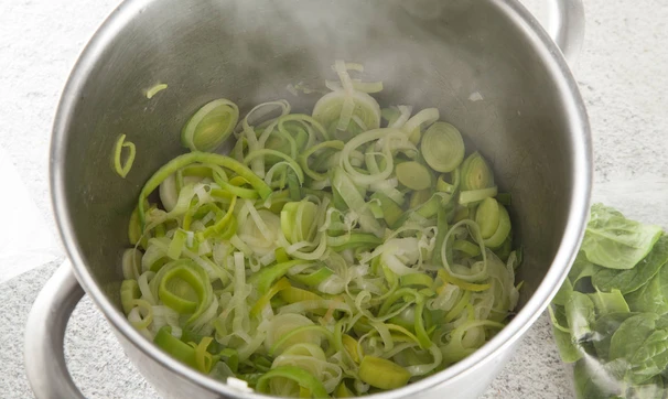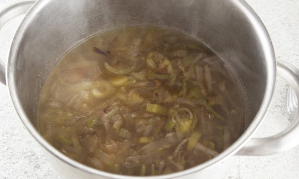 Лук-порей промойте, порежьте колечками, потушите со сливочным маслом на медленном огне до мягкости.