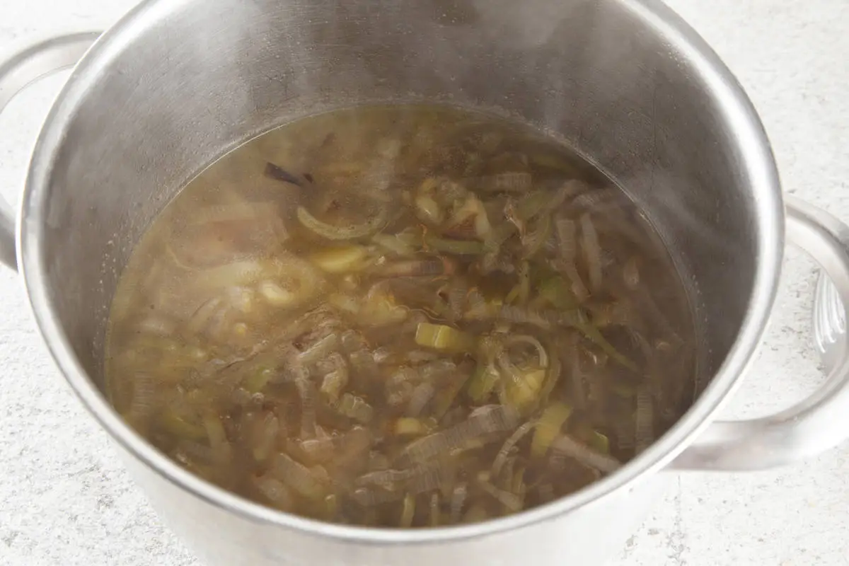 Картофель очистите от кожуры и порежьте кубиками, добавьте к порею, залейте 1,5 л воды и варите до мягкости картошки.
