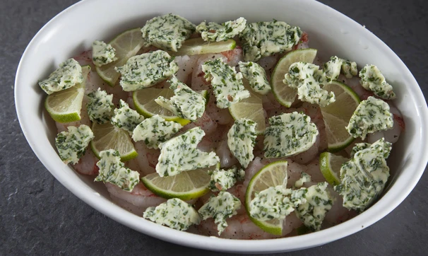 Креветки с зеленым маслом и лаймом