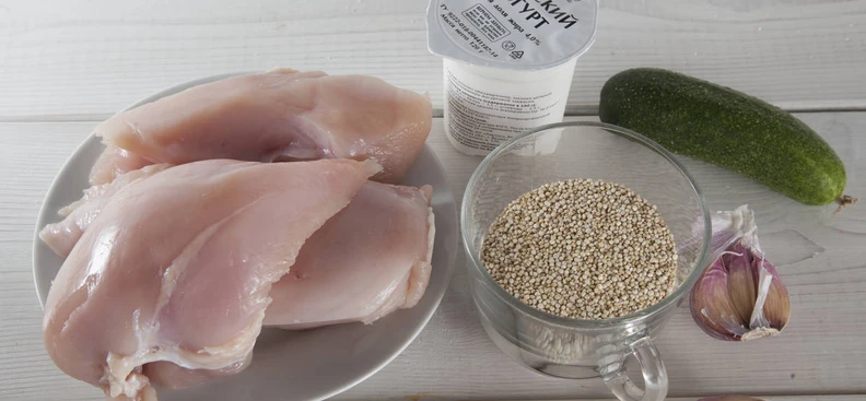 Куриные грудки в панировке из киноа с соусом дзадзики