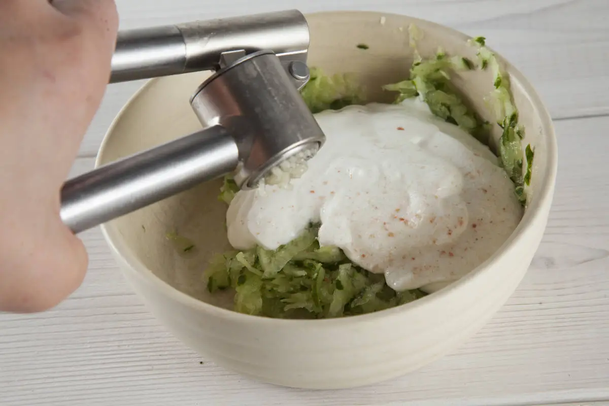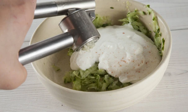 Пока варится киноа, приготовьте соус – огурец натрите на терке для моркови, слегка отожмите и слейте лишний сок, смешайте с греческим йогуртом, измельченным чесноком и специями, оставьте настояться.