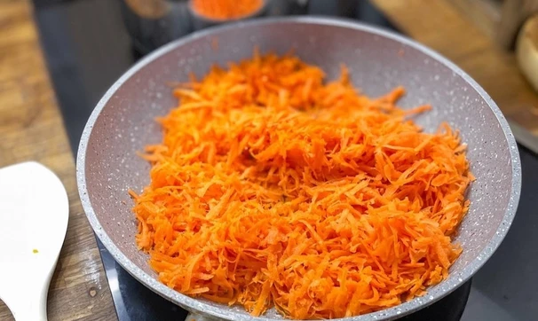 Почистите и натрите морковь на крупной тёрке. Обжарьте на предварительно разогретой сковороде с растительным маслом.
