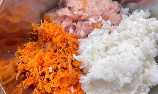 В отдельной ёмкости смешайте фарш, половину жареной моркови, рис и специи.
