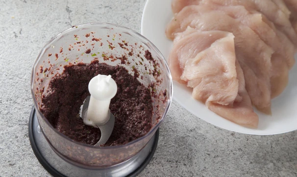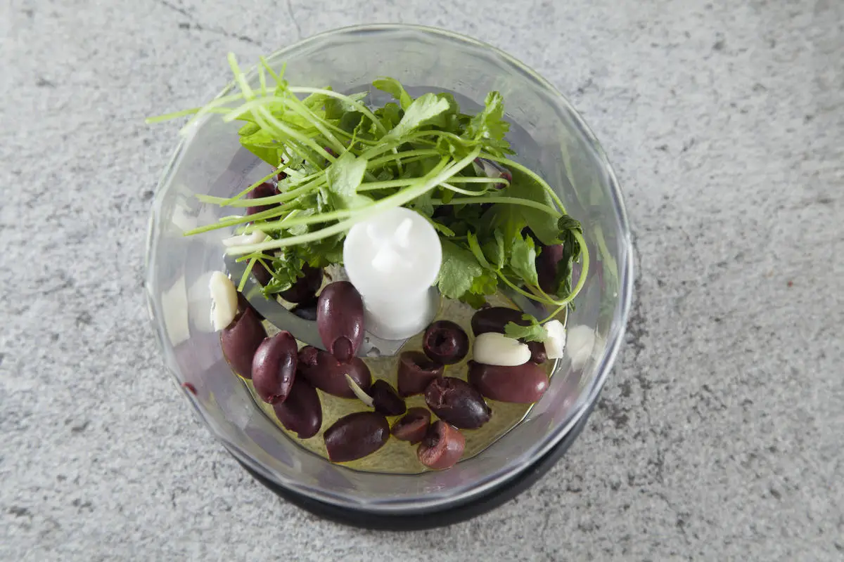 Оливки (без жидкости), чеснок и петрушку с оливковым маслом пробейте в блендере в пасту.