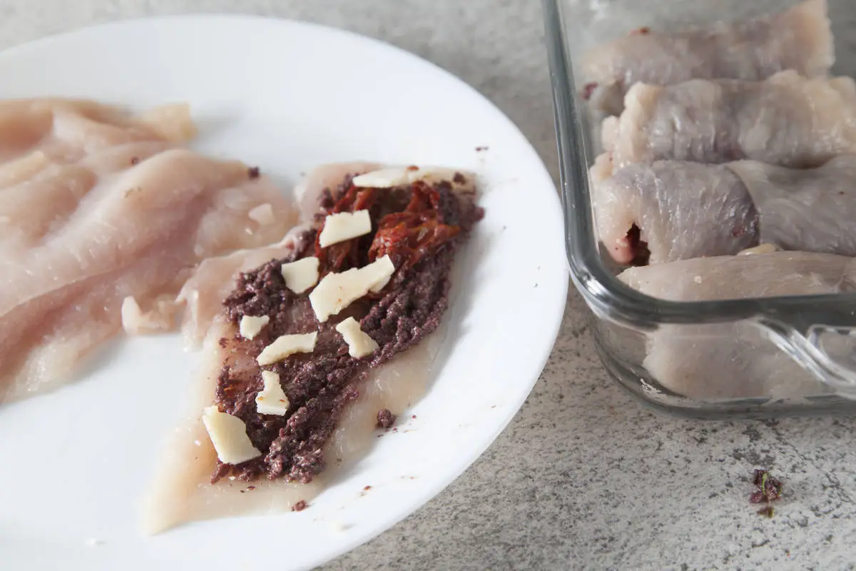 На ломтик куриной грудки намажьте примерно столовую ложку получившейся пасты, сверху выложите 1-2 вяленых помидорки и по тонкому ломтику сыра, сверните в рулетик и закрепите зубочисткой.