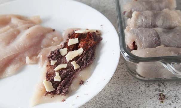 Тонкие аккуратные слайсы куриной грудки так и просятся в рулетик, а начинку сделаем в средиземноморском стиле, с греческими оливками и вялеными помидорами!