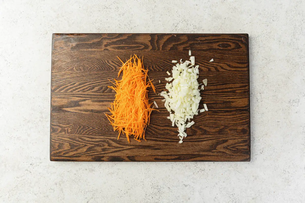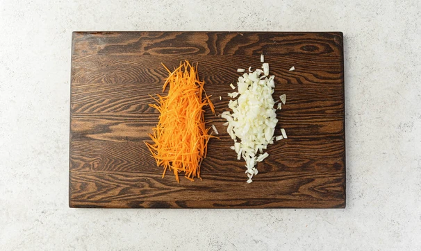 Нарежьте лук кубиками, морковь измельчите на тёрке (лучше использовать специальную для моркови по-корейски) или нарежьте тонкими брусочками. Фунчозу нарежьте крупной соломкой, чеснок измельчите.