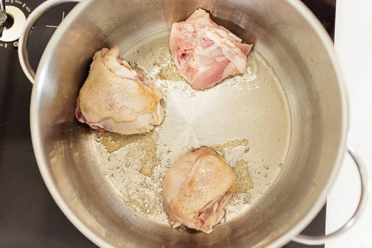 На растительном масле прямо в кастрюле обжарьте курицу, затем добавьте овощи, обжарьте всё вместе до мягкости моркови.