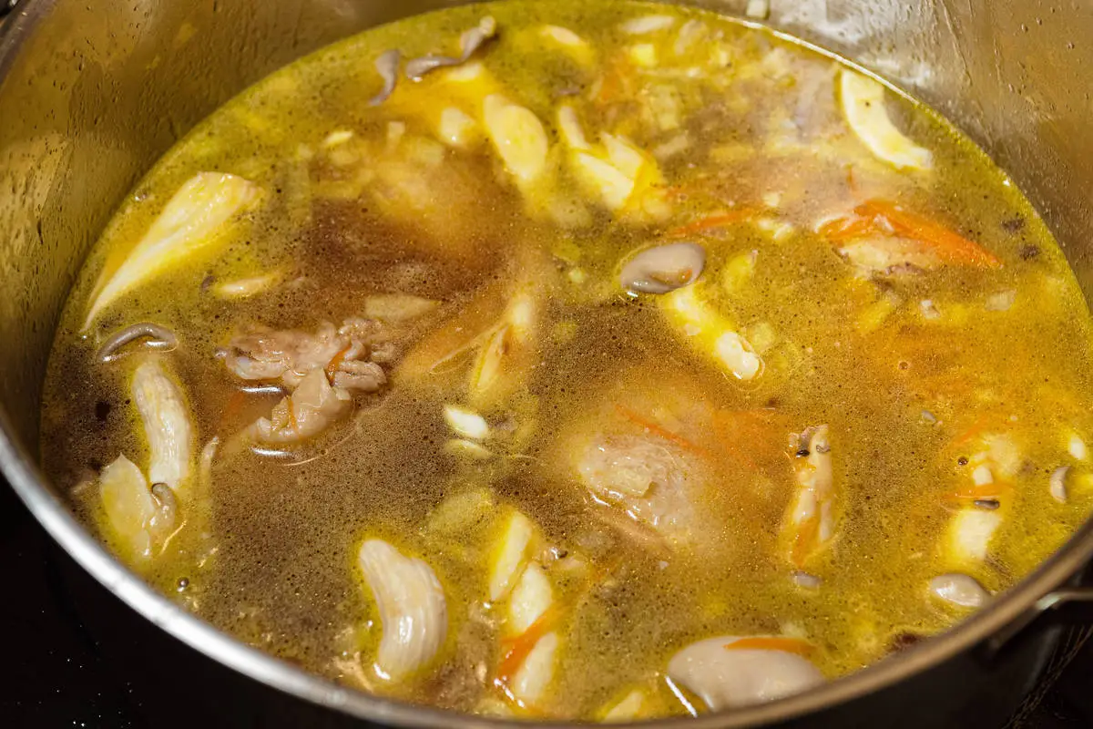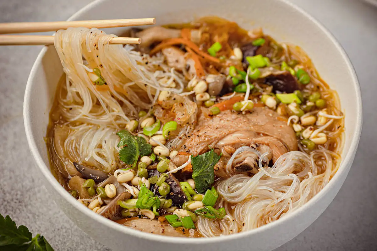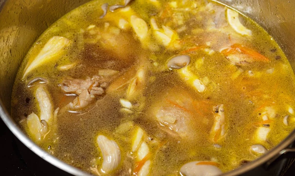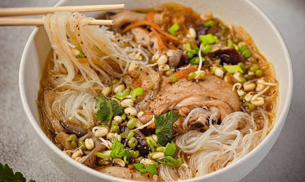 Куриный суп с фунчозой, грибами и овощами