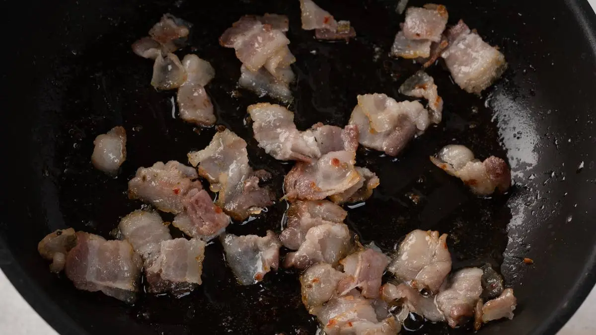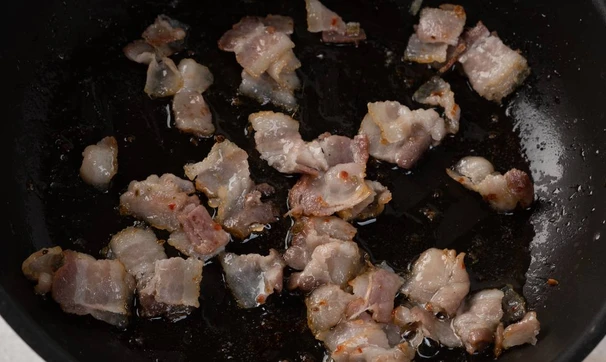 Бекон нарежьте квадратиками и поджарьте на сухой сковороде на медленном огне до золотистости, выложите на тарелку. Лук измельчите, обжарьте на жире, оставшемся от бекона.