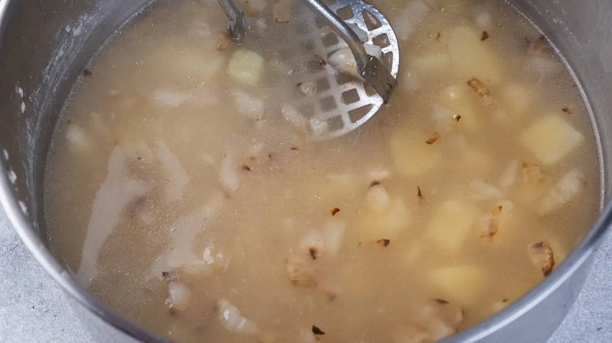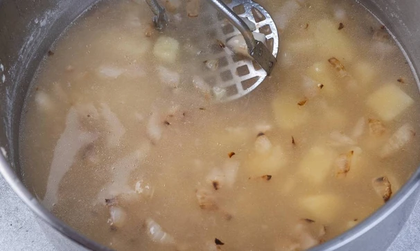 Когда картофель сварится, выньте куриные голени (они тоже должны быть готовы), добавьте в суп лук, ручной толкушкой разомните картофель прямо в бульоне. Если хочется совсем однородной консистенции, можно пробить суп блендером.