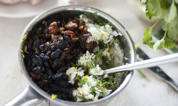 Смешайте рис с порезанными сухофруктами, цедрой, апельсиновым соком, специями, зеленью и сливочным маслом, посолите по вкусу.