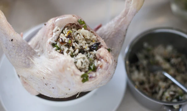 Ароматная, поджаристая курица с очень вкусным пряным рисом внутри — отличный вариант к празднику!