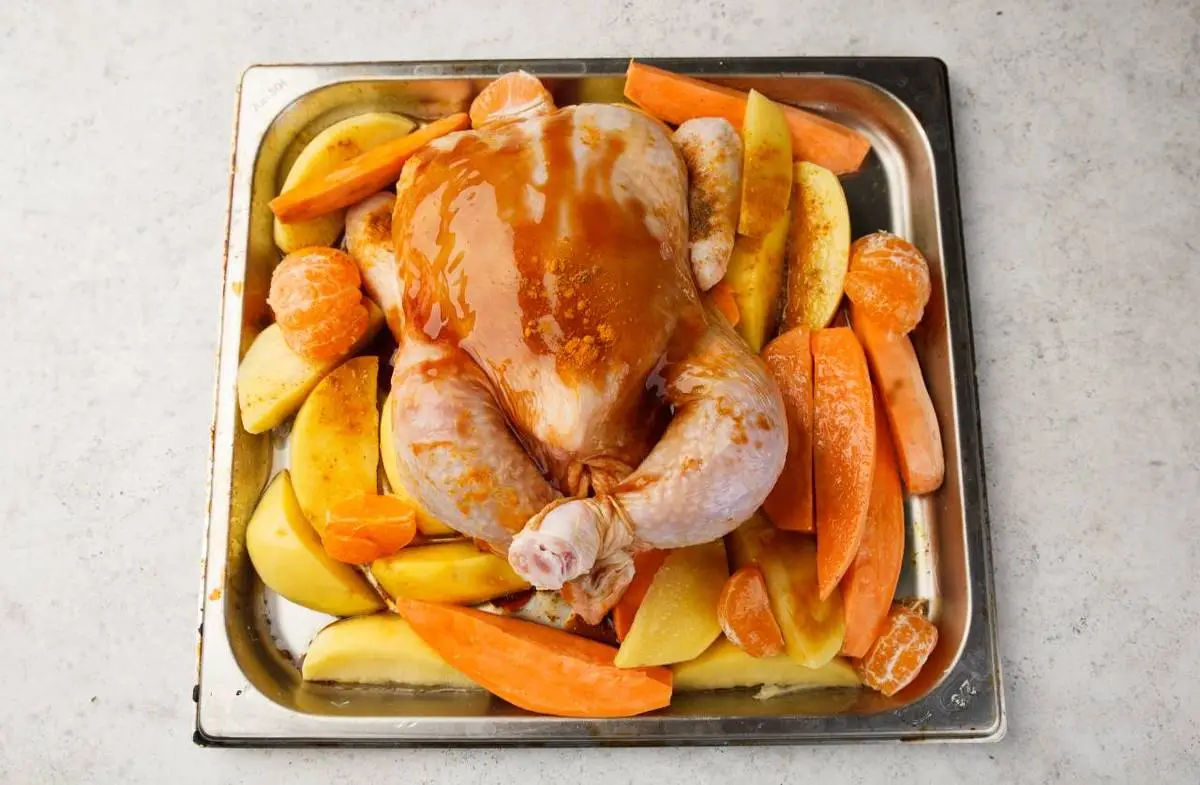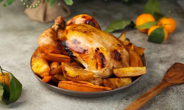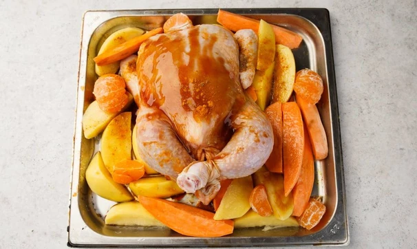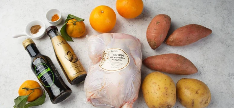 Курицу натрите солью и специями, смешанными с соусами. Мандарины очистите, апельсин тщательно вымойте и нарежьте дольками. Начините курицу цитрусами, свяжите ножки вместе при помощи бечёвки, так запечённая птица будет выглядеть более аккуратно и празднично. Картофель и батат очистите от кожуры и нарежьте дольками, посолите, выложите на противень вокруг курицы.