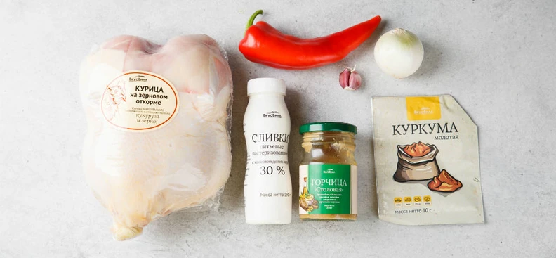 Смешайте обжаренные овощи со сливками, добавьте горчицу и куркуму, перемешайте и вылейте соус на курицу. Убавьте температуру в духовке и пеките при 180°С ещё 30-40 минут до готовности.