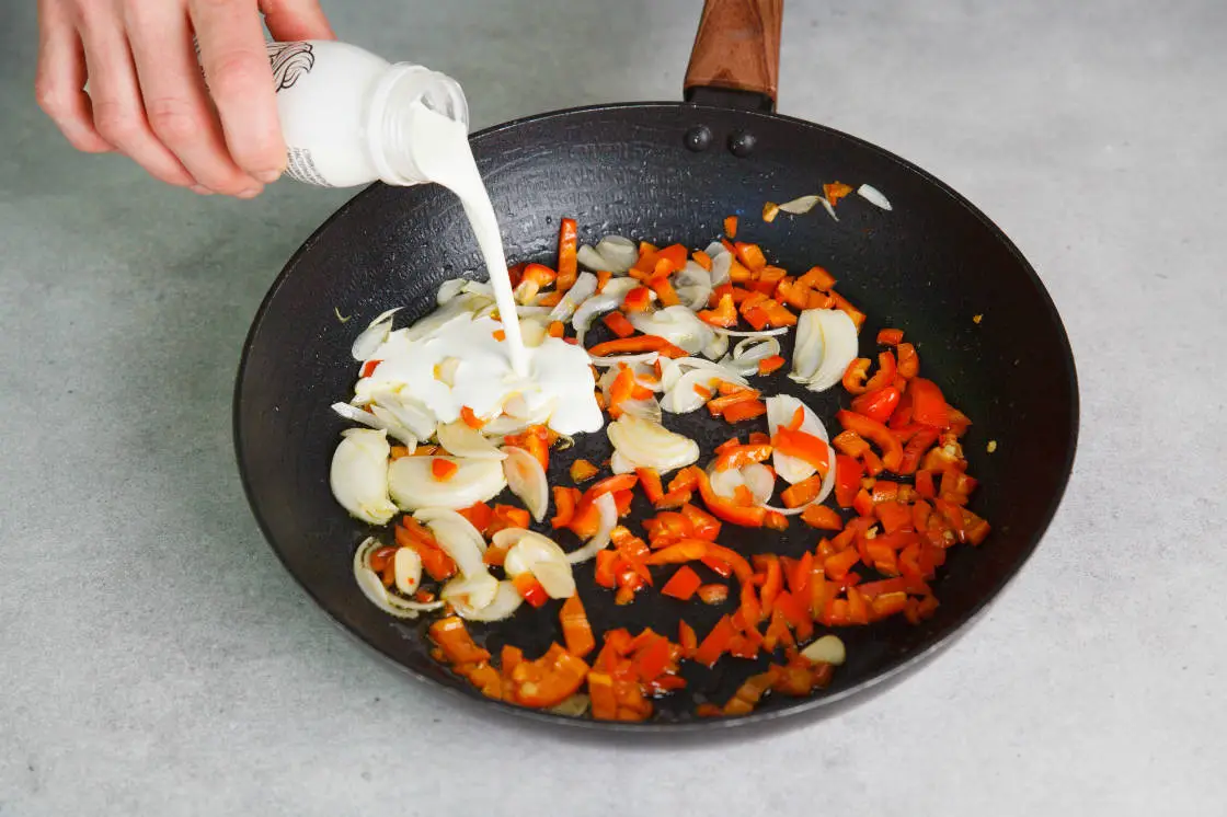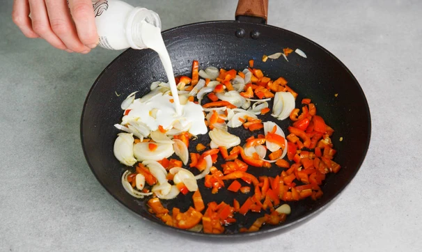Болгарский перец нарежьте кубиками, лук — перьями, чеснок мелко порубите. Обжарьте всё вместе на оливковом масле.