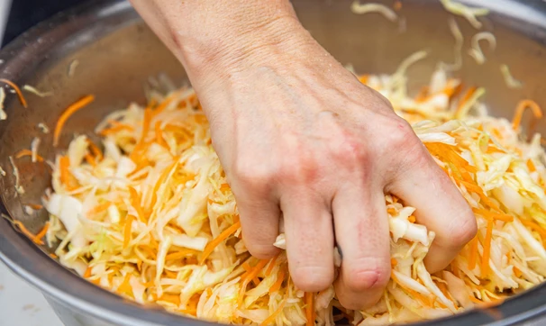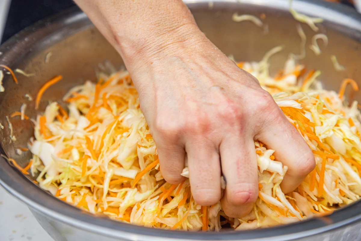 Помните капусту и морковь руками, прикладывая достаточно силы для того, чтобы из них выделился сок.
