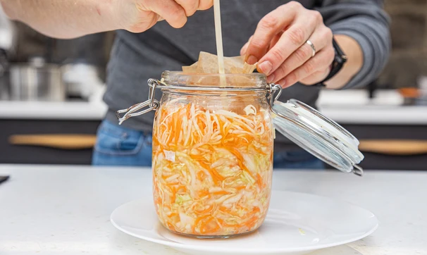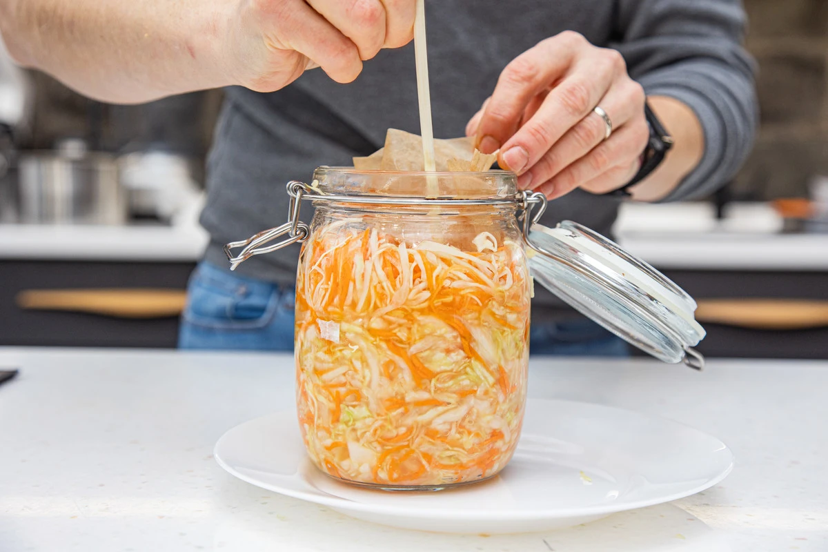 О том, что начался процесс брожения, вы узнаете по характерным пузырькам и запаху. Всю пену, которая образуется на поверхности, нужно снимать. Обязательно дважды в день «протыкайте» капусту на всю глубину банки в двух-трёх местах: это поможет скапливающимся газам активнее выходить из продукта, а капуста впоследствии не будет горчить. Весь сок, «убежавший» из банки, лучше вернуть в неё.