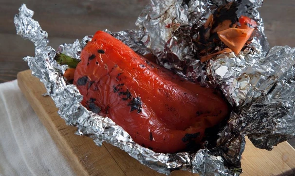 Болгарский перец подпеките со всех сторон до черных подпалин — это можно сделать в максимально разогретой духовке под грилем или прямо на огне конфорки, затем быстро уберите в пакет (лучше использовать небольшой плотный бумажный) или небольшой, плотно закрывающийся контейнер.