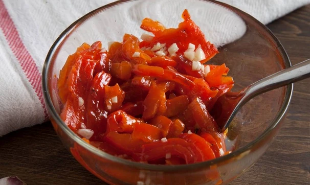 Когда перец слегка остынет, снимите кожицу, нарежьте мякоть полосками, посолите, поперчите и смешайте с оливковым маслом, рубленым чесноком и петрушкой.