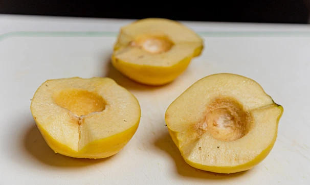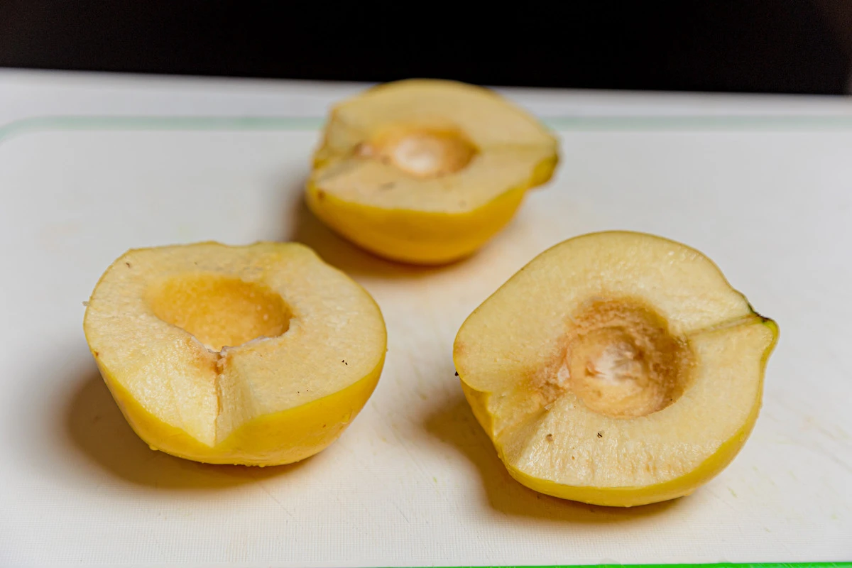 Айву разрежьте пополам, удалите сердцевинку, нарежьте тонкими ломтиками.
