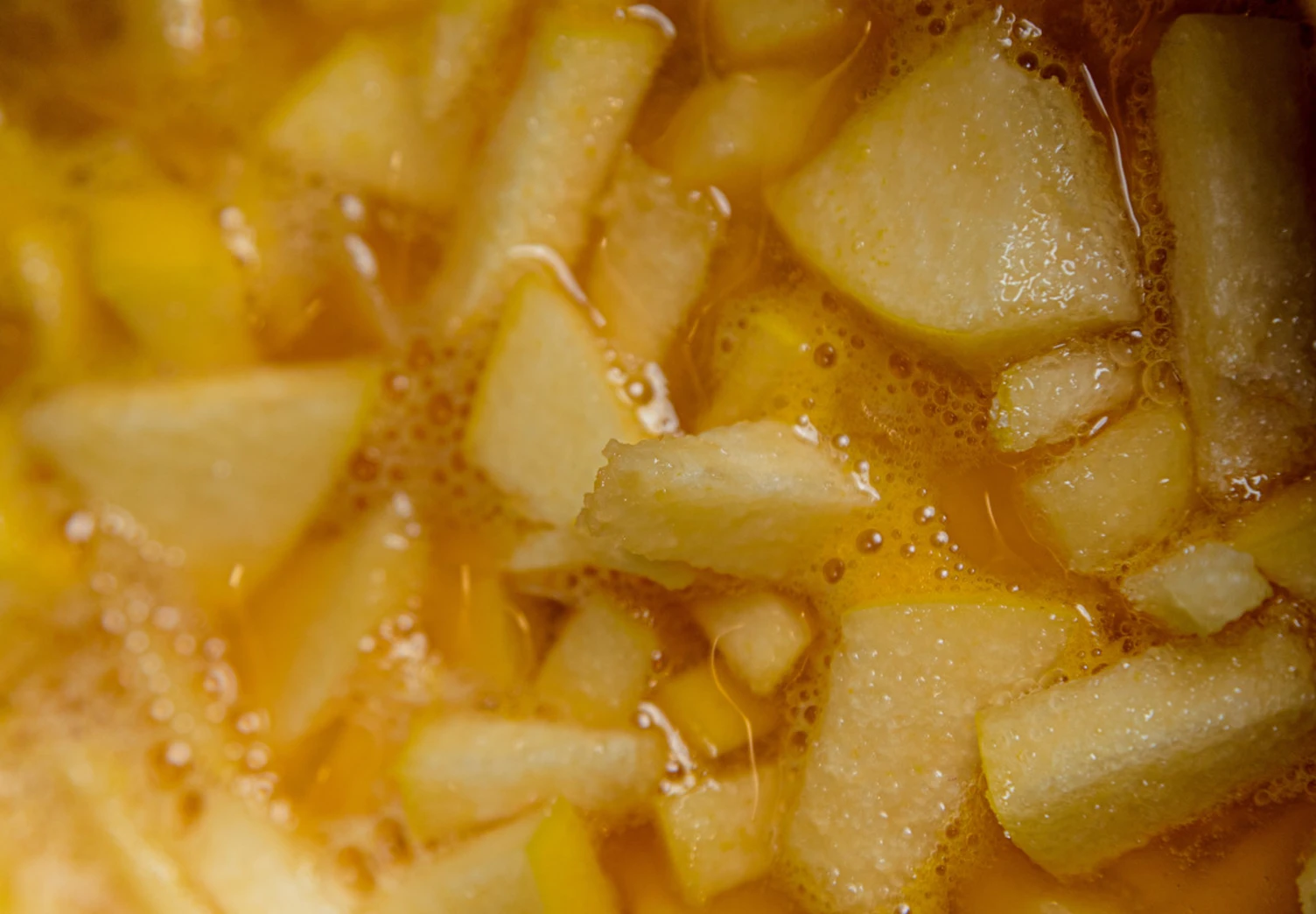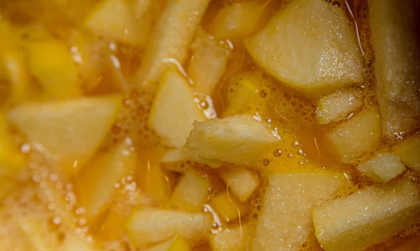 Сложите айву в сотейник, добавьте 60 г сахара, сок двух апельсинов и 100 мл воды. Доведите до кипения и варите 15-20 минут на слабом огне до мягкости.