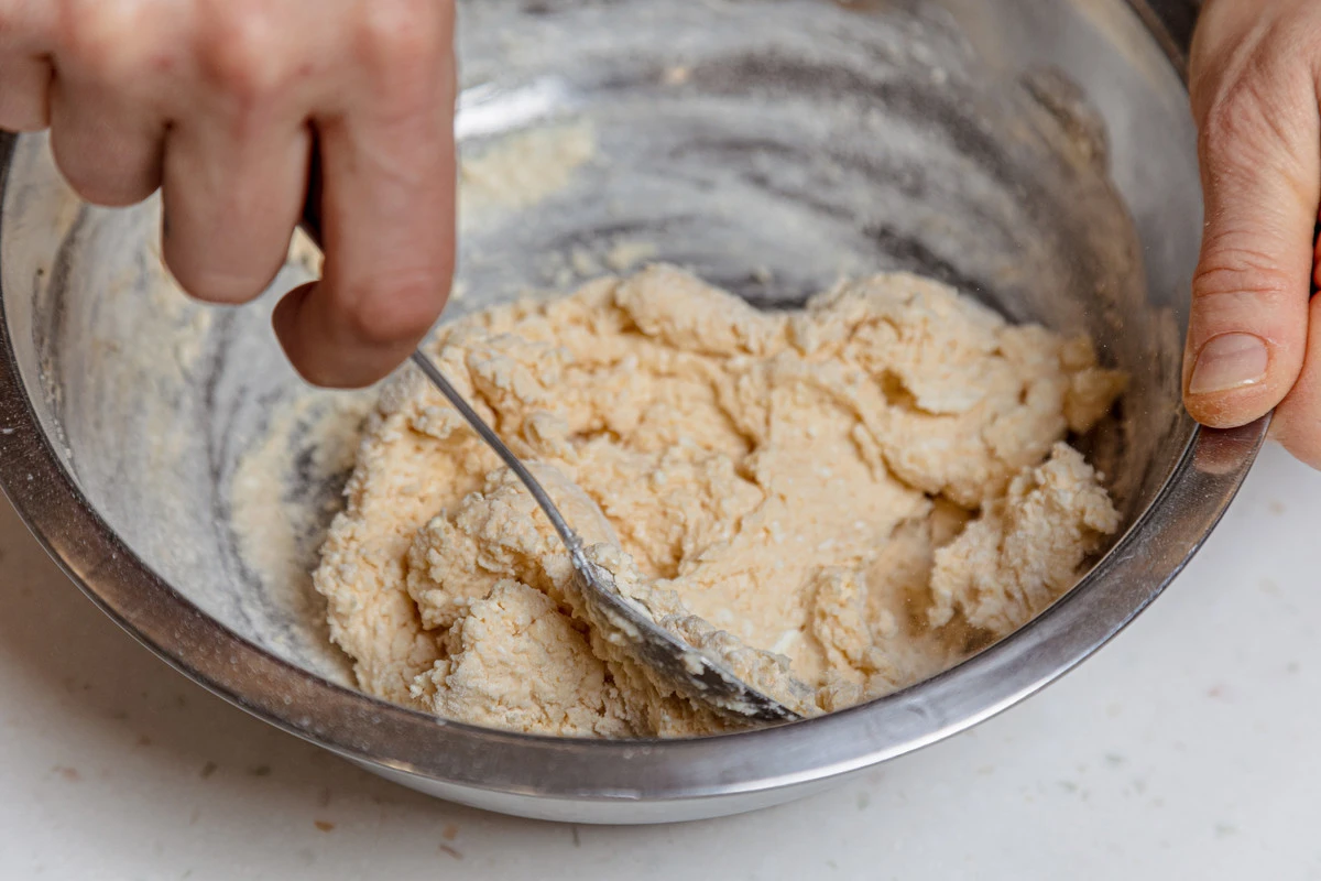 Творог выложите в миску, добавьте щепотку соли, яйцо и 2 ст. ложки сахара, перемешайте. Затем всыпьте муку и перемешивайте, пока тесто не перестанет прилипать к стенкам посуды.
