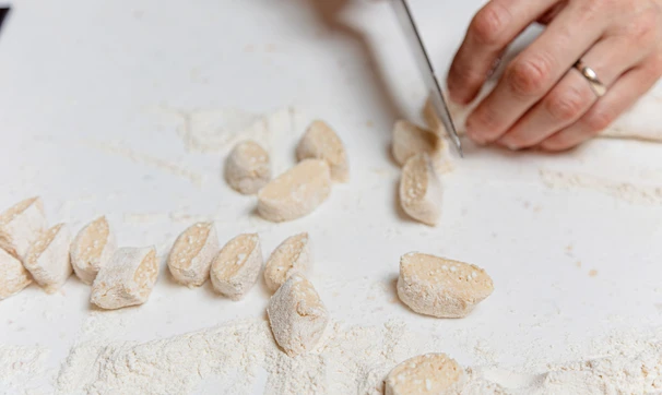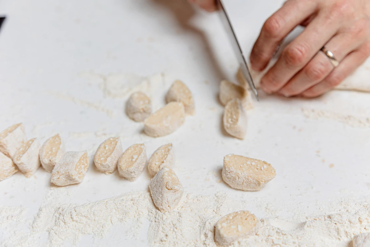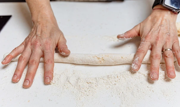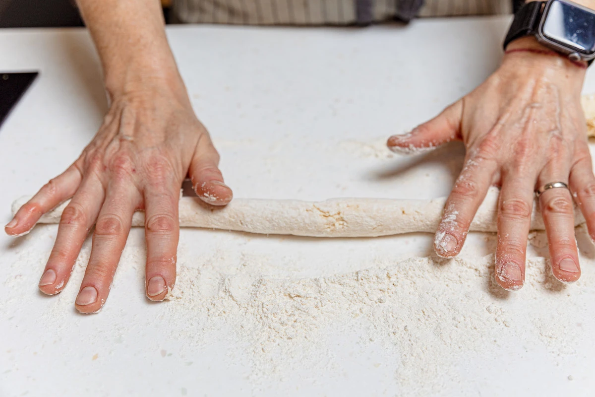 На стол насыпьте немного муки, выложите творожное тесто. Раскатайте его в тонкую колбаску.
