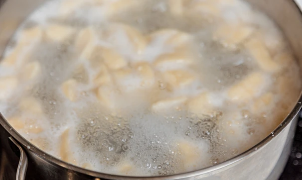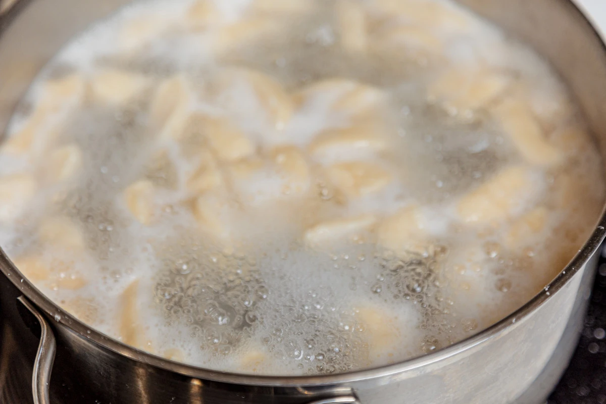 Вскипятите воду в кастрюле, положите вареники и варите около 7 минут.