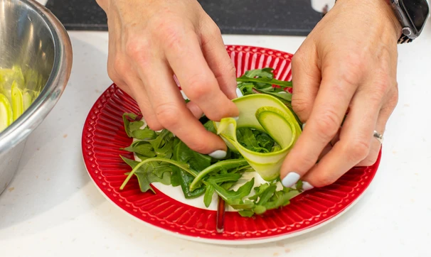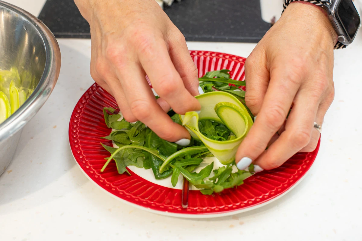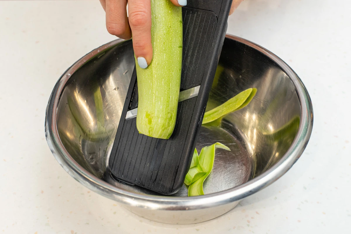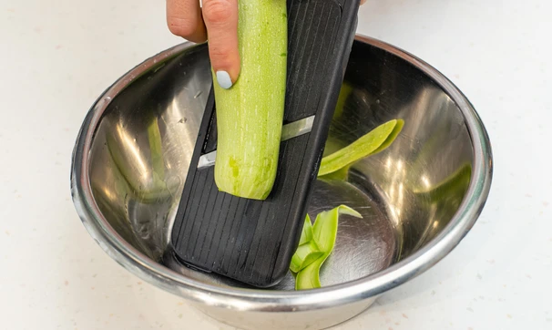 Кабачок с тонкой кожицей нарежьте тонкими слайсами при помощи овощечистки, ножа или тёрки.