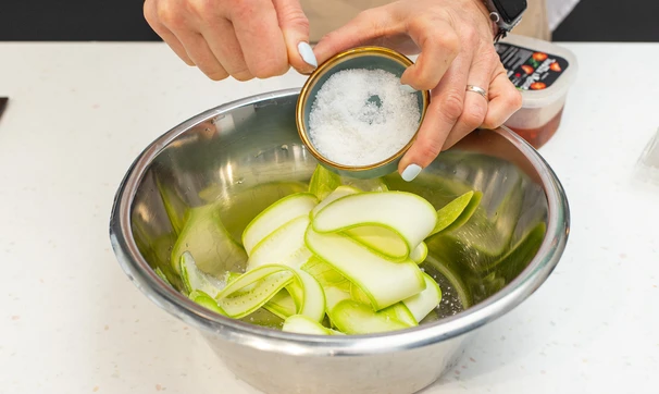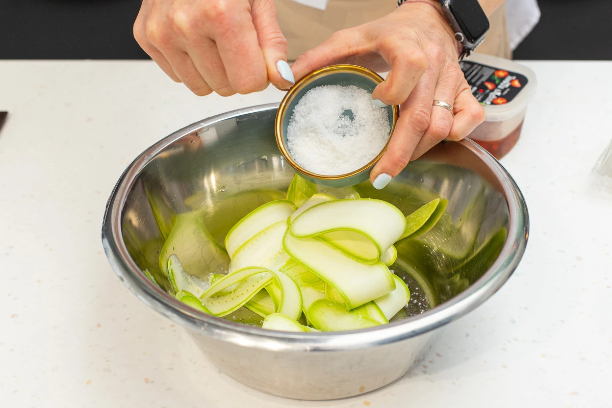 Посолите, перемешайте и оставьте на 10-15 минут. Слейте выделившийся сок.