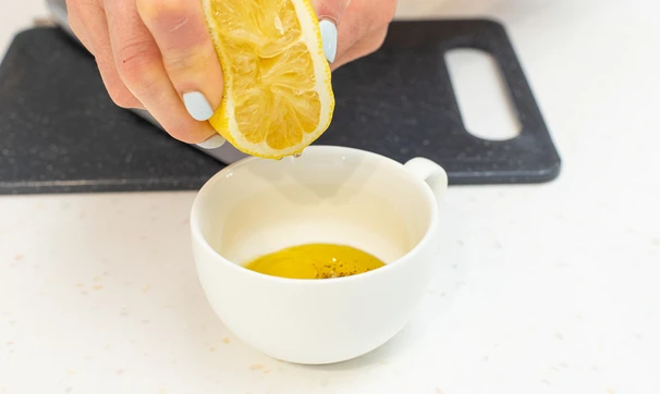 Оливковое масло взбейте с солью, перцем, мёдом и лимонным соком при помощи вилки.