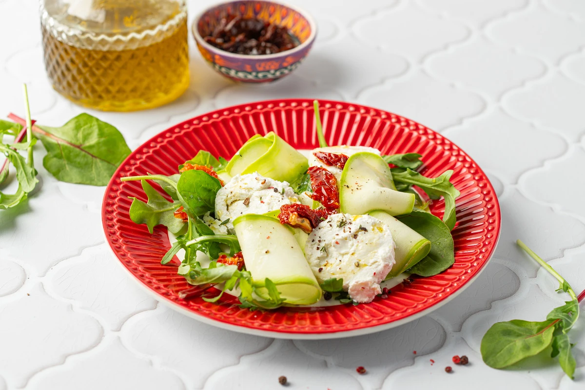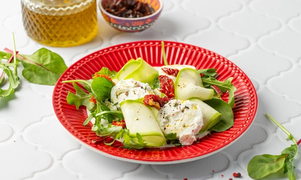На тарелку выложите салатные листья, сверху подмаринованные кабачки, сыр и вяленые томаты.