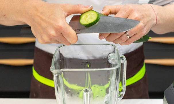 Огурец нарежьте кружочками или длинными полосками прямо в кувшин.