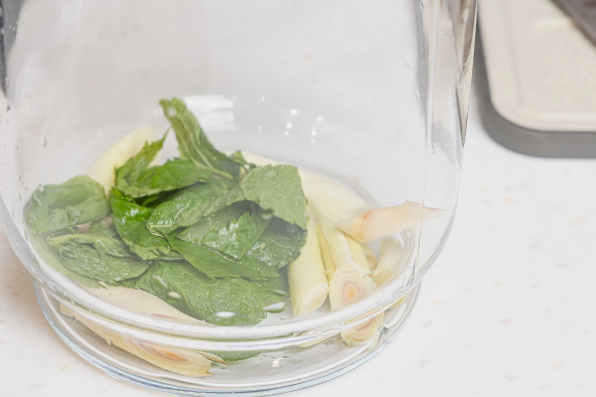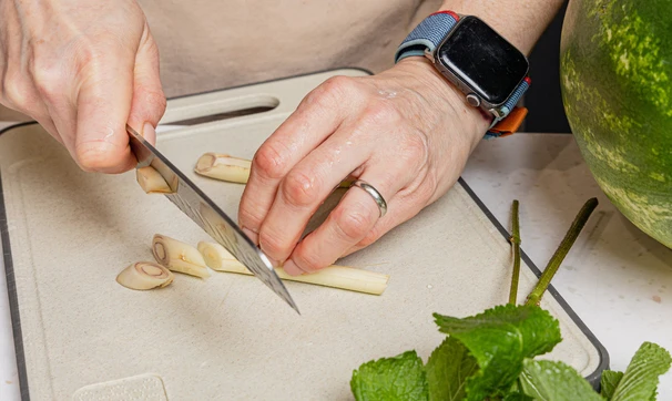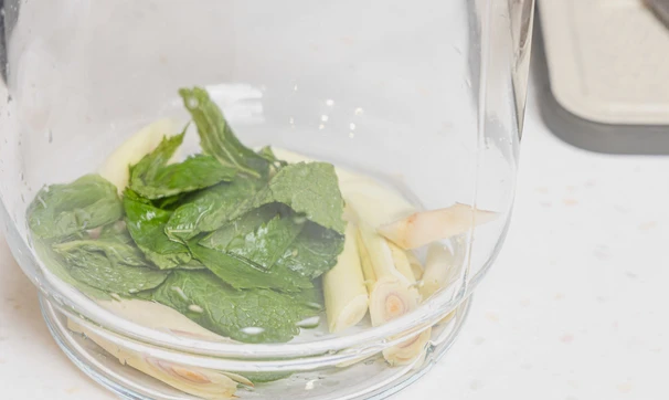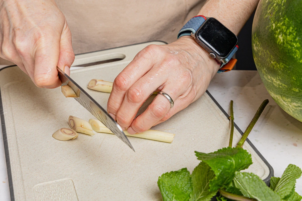 Лемонграсс нарежьте кусочками, каждый стебель — на 4-5 частей. Положите в кувшин.