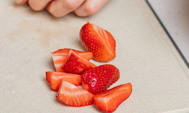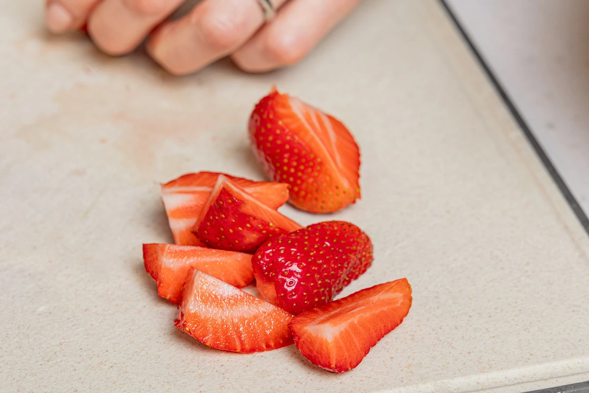 У клубники срежьте плодоножки и разрежьте каждую на несколько частей, особенно если ягоды крупные. Добавьте к мяте с лемонграссом.