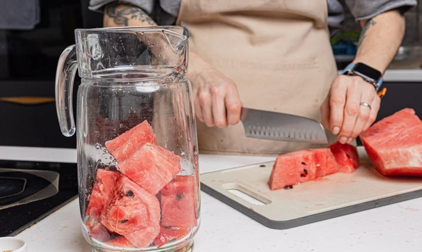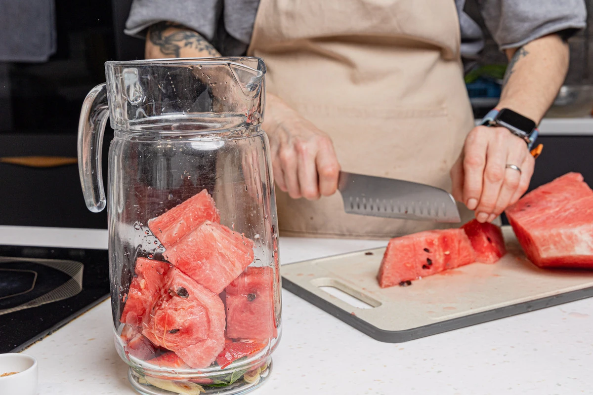 У арбуза срежьте корки, мякоть нарежьте кубиками и также положите в кувшин.
