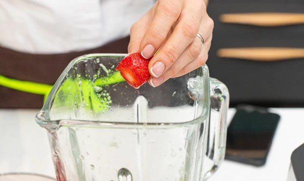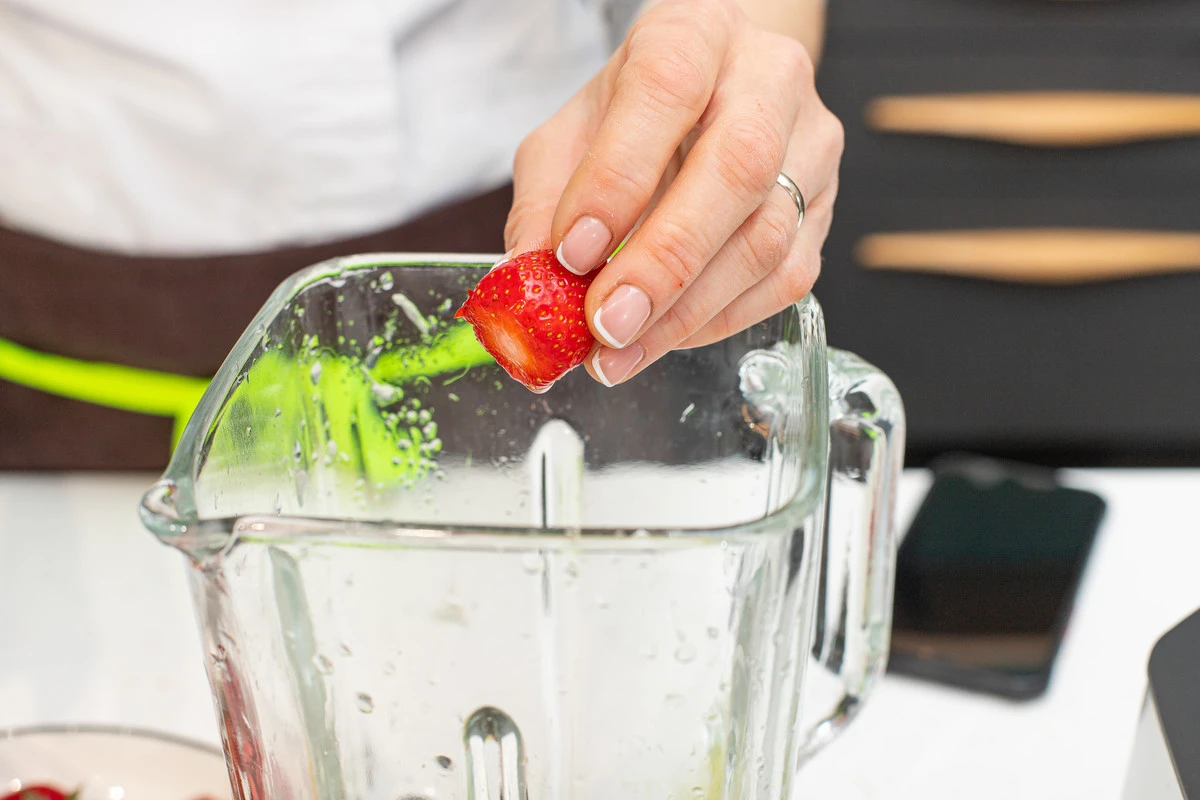 В чашу блендера сложите 100 г клубники, сухой чай матча, выдавите сок половинки лимона.