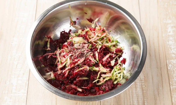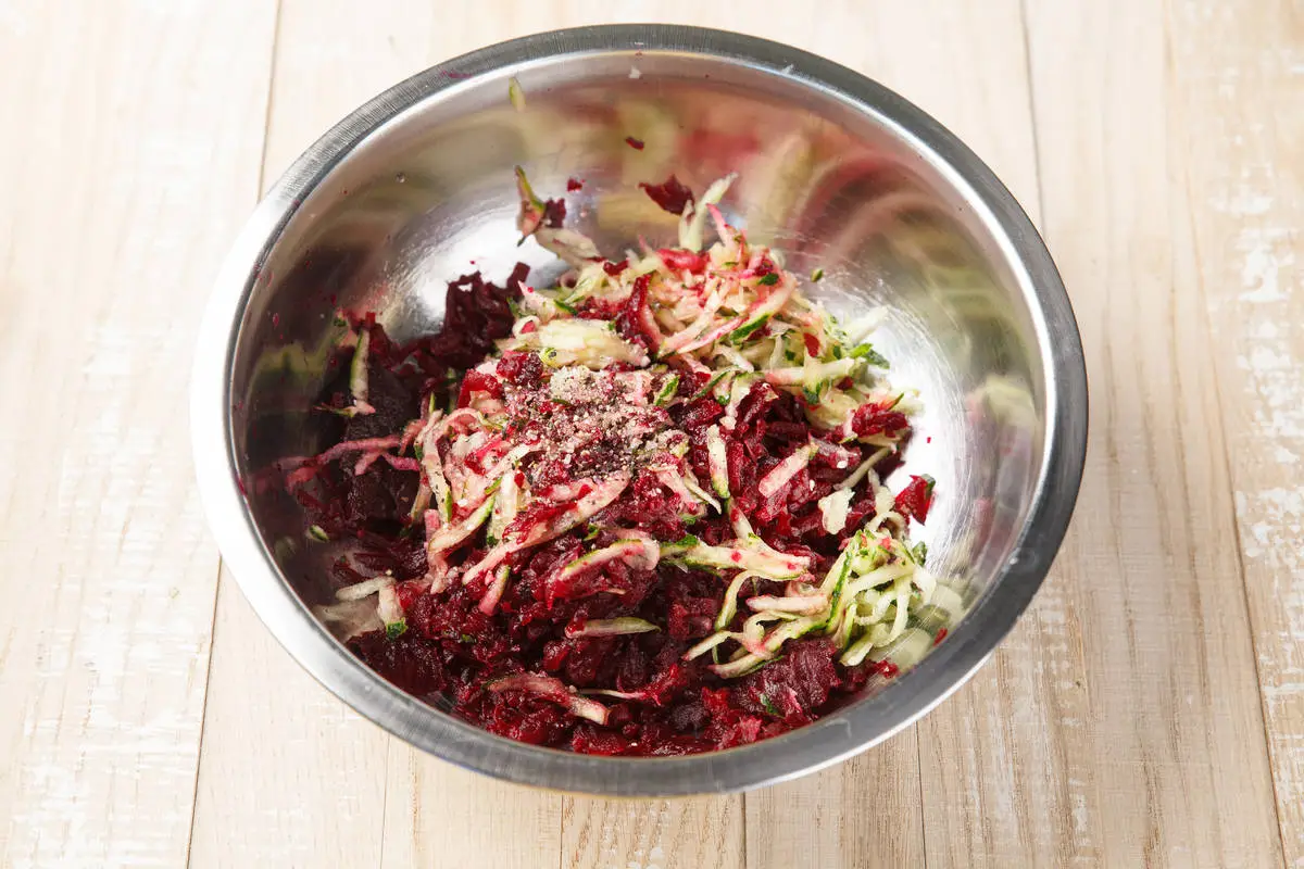 Свёклу и огурцы также измельчите на тёрке, смешайте с яйцами, посолите и поперчите.