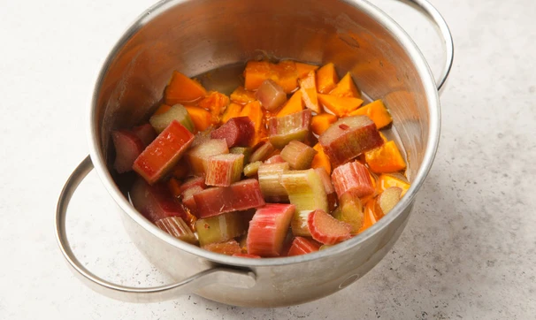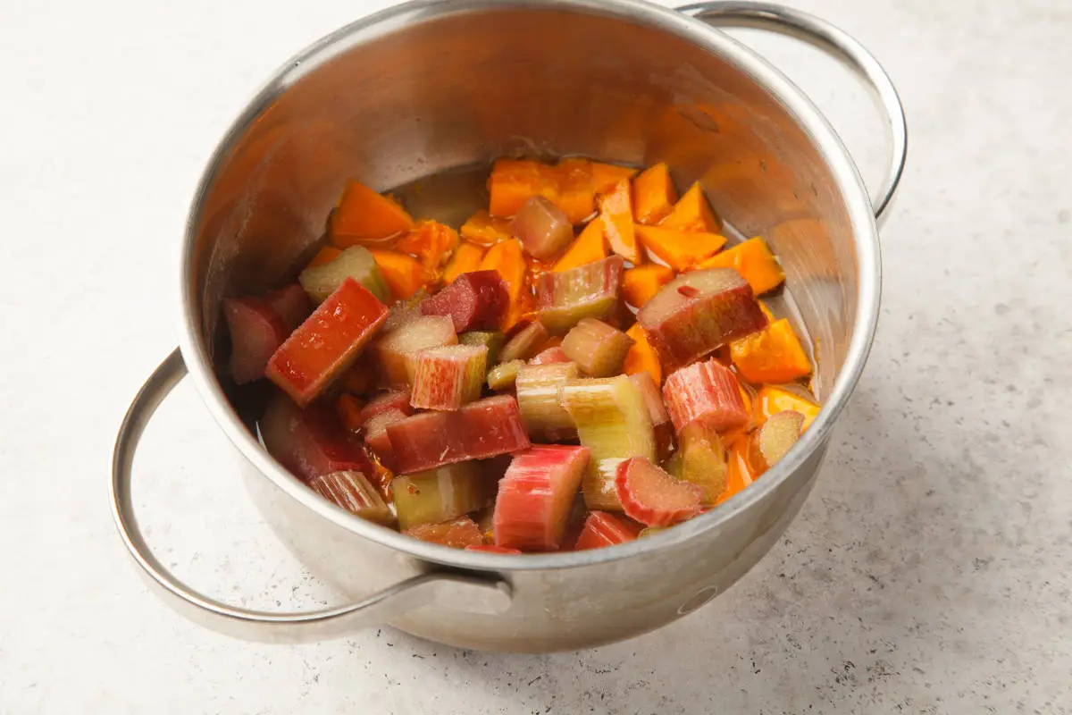 Нарезанную кубиками тыкву и ревень залейте небольшим количеством воды (около 100 мл) в сотейнике, доведите до кипения и варите 5 минут.