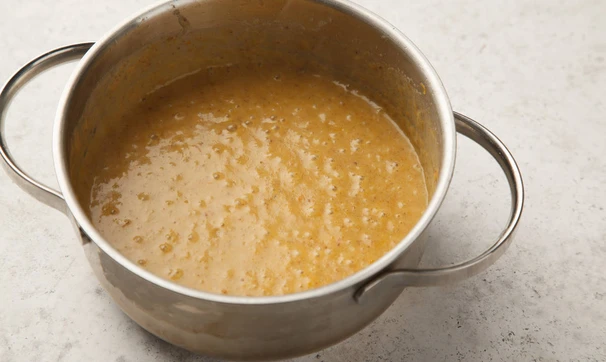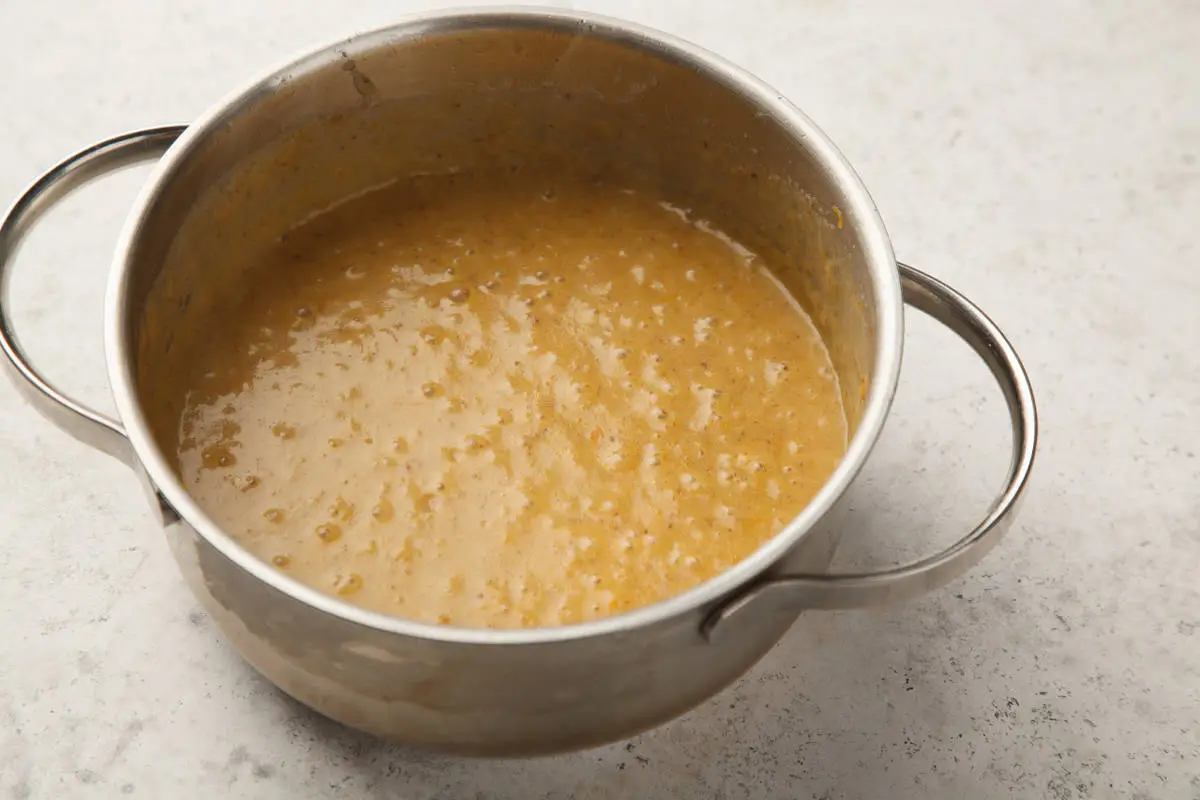 Отложите несколько кубиков тыквы и ревеня для украшения, к остальным добавьте сахар, кокосовое молоко и сухую льняную кашу, всё взбейте блендером.