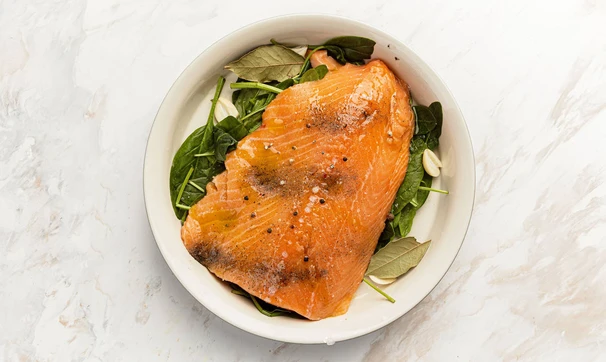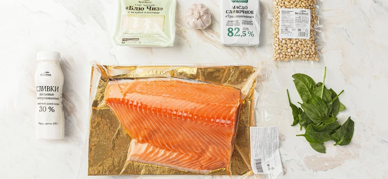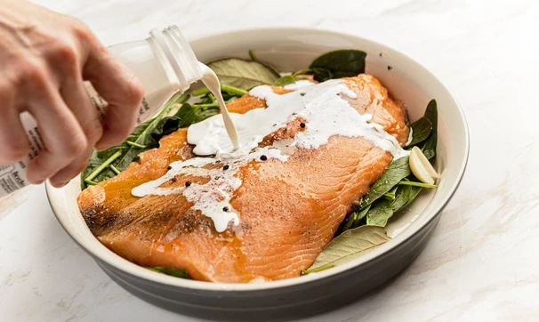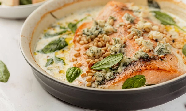 Лосось в сливочном соусе со шпинатом и голубым сыром