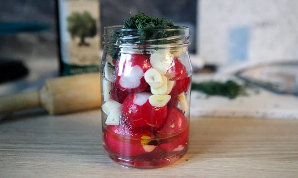 Сложите редиску, чеснок и укроп в банку с крышкой или закрывающийся пищевой контейнер. Добавьте соль, сахар, уксус, оливковое масло и воду. Тщательно перемешайте все ингредиенты, закройте крышкой и уберите в холодильник минимум на 8 часов.
