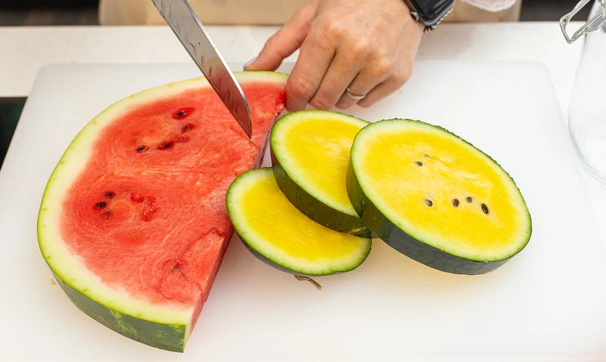 Банки обдайте кипятком. Арбуз помойте и нарежьте на небольшие треугольнички вместе с корками. Для рецепта понадобится 2 арбуза: жёлтый и красный. Вы можете использовать обычный красный арбуз или взять такой, в котором мало косточек — например, «Чёрный принц» или красный арбуз «Яйцо дракона».